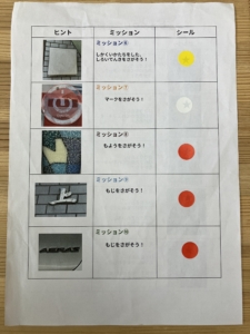 今回は外に行き、たまみずきの周辺にある物(例:車のマーク・建物の文字など)や