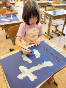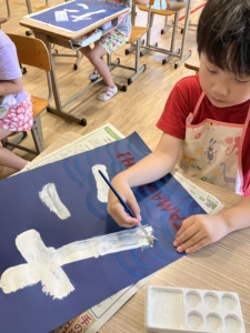 低学年グループは1人1枚、画用紙の上に白色の絵の具で「た」の文字を大きく目立つように書きました!