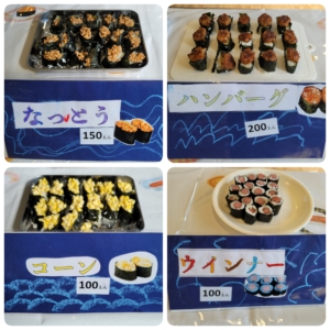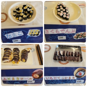 コーン軍艦、納豆軍艦、ハンバーグ軍艦、たまご細巻き、さくらでんぶ細巻き、ウインナー細巻き