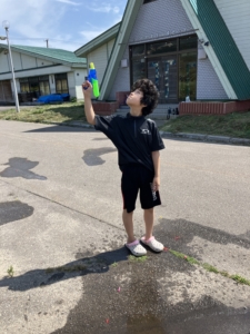 水鉄砲を空に向かって発射し、水がミストのように風に流れながら落ちてくるのを楽しんでいるお友達もいました!