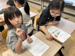 様々な場面を想定して、場面に合った声の大きさは0~5の中でどれかをペアで考えました。