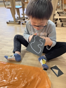 袋を切った後、目・鼻・口のパーツを切り取り、のりで貼り付ける作業をしました!