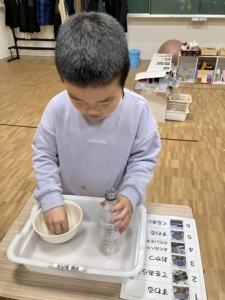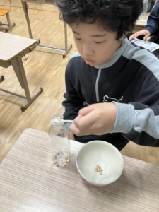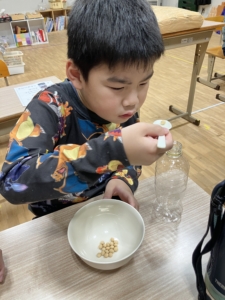 ②大豆を指でつまんだり、道具を使ってペットボトルやコップへうつす