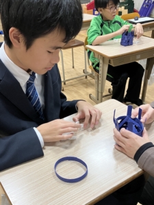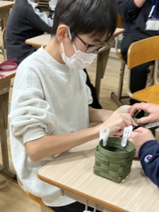 前回作った土台に、輪っかのパーツを通し、バンドが交互になるように編み込む作業を行いました。