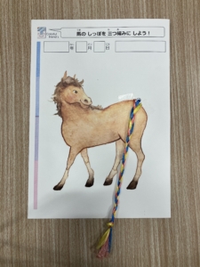 →イラストの馬のしっぽ(スズランテープ)を編んで三つ編みにします