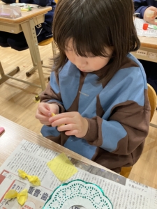 小さいお花紙をねじる作業は、意外と指先や手首の操作性が必要です。