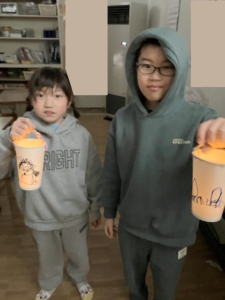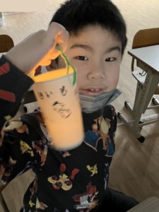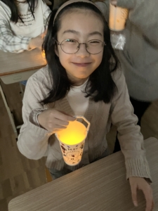 室内を暗くして、ランタンの中の電気をつけると、みんなが描いたイラストがきれいに光ります✨