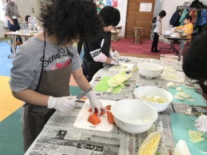 皆で手分けをして食材を切り、自分でおにぎりも握り・・・