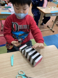 本物のように窓をくり抜いて作る子や、テープでしましま柄にする子や、