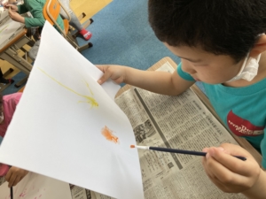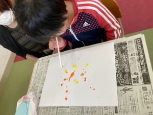 水を多く含んだ絵の具を画用紙にたらし、ストローで息を吹きかけ飛ばしたり伸ばしていって描いていきます!(^^)!