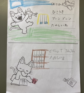 最初はまずイラストを見て、短い文章を考えてもらいました!