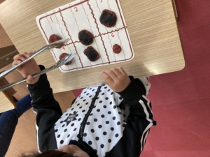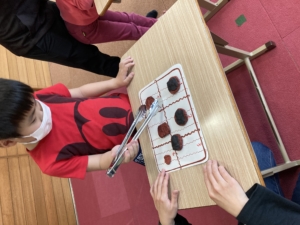 お友達がやっているところを見て 簡単そう!と思っていた子どもたちでしたが、いざやってみると なかなかひっくり返ってくれないせんべいに苦戦していました😥💦