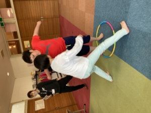 また今回は、2人しっぽとりにも挑戦しました!フラフープを用意して、子(逃げる人)はフラフープの中に入ります。子(逃げる人)はフラフープの中だけ動くことができます。鬼はフラフープの中に入ることはできませんが、フラフープの周りは自由に動くことができます。制限時間内にしっぽを取ったら鬼の勝ち、逃げ切ることができたら子の勝ちです。「もう一回やりたい!」との声も多く、とても盛り上がっていました😀