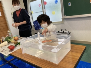 色々な野菜や道具が、水に浮くか沈むかを当てる水クイズをしました。最初に浮くか沈むかの予想をしてから、水に入れて実験しました。「これは軽いから浮くでしょう」「沈むに決まってる!」とクイズを楽しんでいました。クリップは軽いのに沈む・かぼちゃは重いのに浮く・飲み物の缶は浮くものと沈むものがあるなど、意外なものもあってみんな驚いていました😲