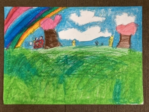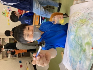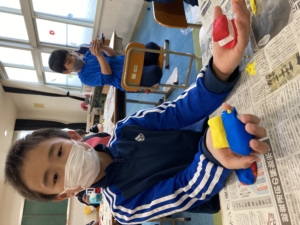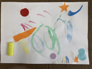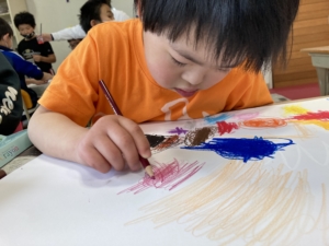 色々な画材を使って絵を描きました。クレヨンと絵の具ではじき絵をしたり、画用紙を貼り付けたり、自由に作品を仕上げました。「太陽と月」「梅干しを食べる女の子」などテーマを考えて製作しているお友達もいました。みんなの個性が光る作品が揃いました✨
