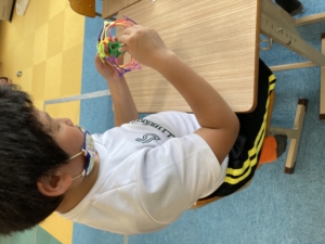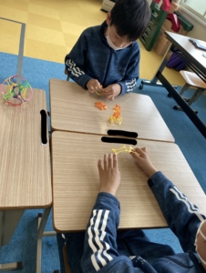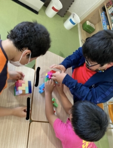 いくつかのグループに分かれ、立体などの見本をみて、どう組み立てているのかを観察しお友達と協力をして同じように組み立てていきます!