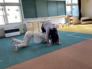 ④魚のフライゲーム:1人の子がうつ伏せになり、もう1人の子が10秒以内にその子を仰向けにするゲームです。うつ伏せの子は10秒間必死に床にくっつきます!大盛り上がりでした(^^)/☆
