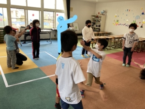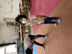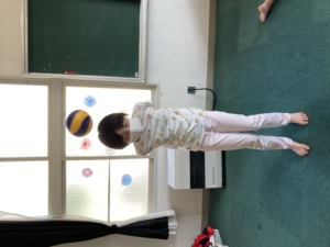 お友達と向かいあって右手でボールを投げるを10回、左手で投げるを10回しました。