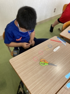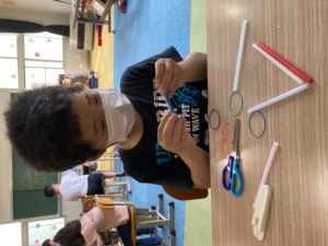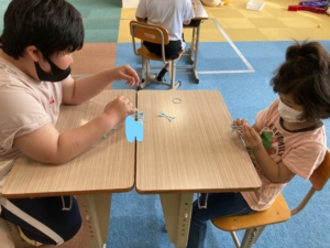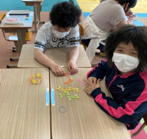 テンセグリティという工作があり、そのテンセグリティが完成するまでの途中の部分までをお手本を見て挑戦してもらいました!