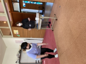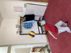 自分の上にボールを投げてボールが自分の手元に戻ってくる前に職員をみて、職員がグー、チョキ、パーのなにを出しているかを見分けるゲームです!