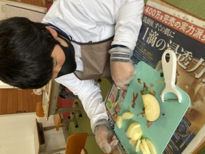 ドーナツの中にチョコやチーズ、自分たちで作ったリンゴジャムなどを入れて食べました!