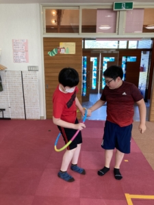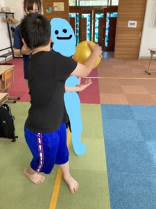 最初はボール渡しから始まり、2人で手をつないでコロコロ横に転がる競技や、先週行った2人でボールを持ち、その上にボールを乗せて落とさないように運ぶ競技などをこなしていきます👬!