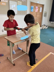 目隠しをして敵の気配を感じたら新聞紙ボールをなげて、相手の体にボールがあたったら勝ちというルールです⭕