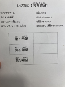いつもは挙手をして多数決で決めるレク決めですが今回は投票制できめました!