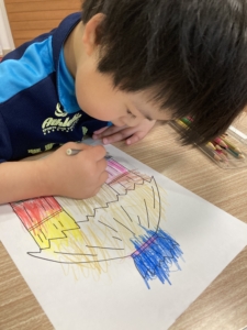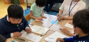 実際に使うペープサートを自分の好きな色に塗れてうれしそうな子どもたち🐈