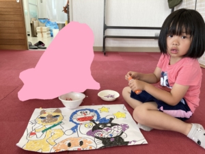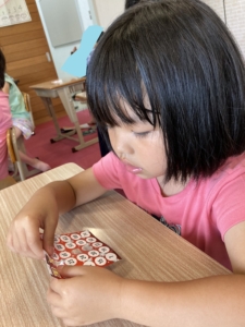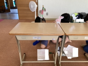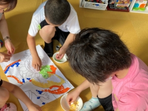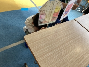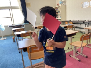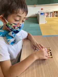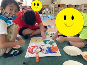 前回色塗りをした紙人形を使って、動きをつけながら劇の練習をしました。紙人形は表と裏で違う絵柄のものもあり、表から裏に返すのが難しそうでしたが、練習をするうちにタイミングを掴んでいました!動きだけでなく、セリフやナレーションも忘れないように真剣に取り組んでいました。