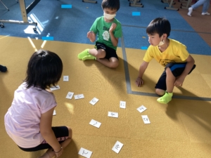 2チームに分かれての対決です💡各文字1枚ずつのひらがなカードを場に広げます。1人ずつ順番に、場のひらがなカードの中から言葉を作っていきます。1度使ったひらがなカードは使うことができません。制限時間内にたくさんのひらがなカードを使ったチームの勝ちです。