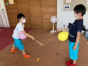 お腹に風船をつけてにょい棒で相手の風船をたたきます。最初にたたけた人が勝ちというルールです⚔