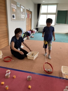 投げた輪の中に入った的をひもで引き寄せて、時間内に多くの的を引き寄せられたチームの勝ちというゲームです✨