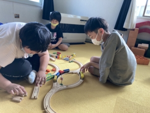 線路を作っているお友達のところへ「入れて~!」と入って行き、みんなで仲良く町を作っていました(^^)/☆