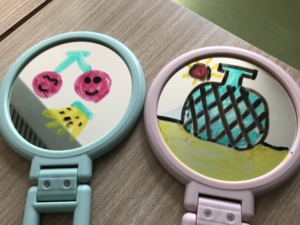 鏡にホワイトボードのペンで好きな絵を描き、ボウルには魔法の水(水+炭酸水)を用意し絵が描かれている鏡を水の中でゆらゆら動かすと・・・?