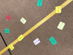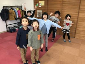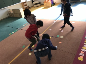後半には、2チームに分かれて絵しりとりやたくさんの玩具等を使ってどのチームが1番長い列を作ったかの列ゲーム、最後には1列鬼ごっこをしました。