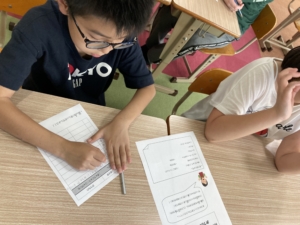 各ペアのマジックが決まり、マジック練習に入りました。何度も練習をしてコツを掴んでいました😀自分の知っているマジックを選んだお友達は、発表する際の原稿も自分で考えました。協力がテーマのマジック。二人で声を合わせたり、盛り上げたりしながら練習に取り組んでいました。