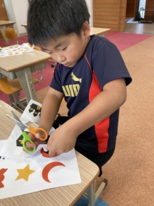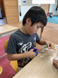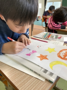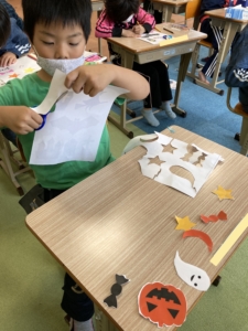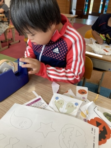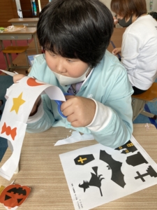 ハロウィン仕様のモビール作りをしました。コウモリ・おばけ・カボチャなどのイラストを切って、紐に貼り付けたら完成です!イラストに自分で色を塗るお友達もいました🎃かわいいモビールは玄関に飾ってあります♪