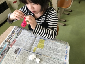 作り方は風船の中に紙粘土を入れるだけ!、、、ですが風船の中がいっぱいになるのには、たくさん詰めなければなりません。大変でしたが頑張って作り、最後はにぎにぎと感触を楽しんでいました😳