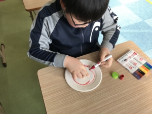 紙皿に絵を描き、裏面にペットボトルのキャップをつけて割り箸で回すだけです☆
