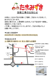 改修工事のお知らせ 日頃は、たまみずきの活動にご理解、ご協力いただきまして、ありがとうございます。 改修工事のため、工事期間におきましては下記住所へ移動し、活動を行ってまいります。 ご不便、ご迷惑をおかけいたしますが、ご協力の程よろしくお願い申し上げます。 ▼改修工事期間▼ 2022年2月14日(月)~2022年3月22日(火) ※改修工事の終了日は前後する可能性がございます。 ▼移転先住所▼ 上ノ国町字大留55ー8 旧上ノ国ダム合宿所 2022年1月28日活動日記