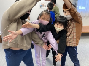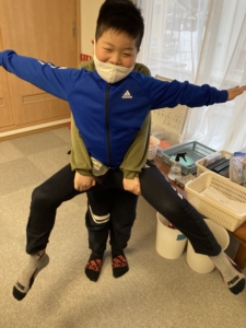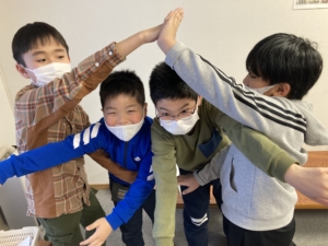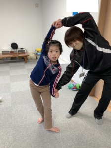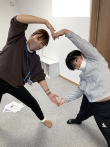今回は2人で「ハート」「人文字(いくつかある中からチームで選択しました)」を練習・発表した後、4人でのポーズにも挑戦しました!「これどうなっているの?」とチームで話し合う姿が多く見られ、協力して取り組んでいました。人文字はいくつかある中からチームで好きな人文字を選択したのですが、「この字はできたから次の字も練習しよう!」ととても意欲的に楽しんでいました。後ろの人が、大の字ポーズの前の人を持ち上げる”木”の人文字が人気でした✨