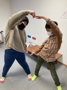 3月月曜日の活動テーマは「見本を見て身体で表現しよう」です。見本(写真)を見て、2人以上で見本のポーズをできるように力を合わせます。身体の使い方がどうなっているかを見て考えながら身体を動かしたり、一人ではできないのでお友達と協力したり、教え合ったりする力が求められます。徐々に難しいポーズになり、最後は6人で行うポーズに挑戦する予定です💪