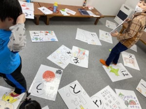 後半は巨大カルタをして遊びました。みんな取るのが早く、全員が札を取ることができました👏最高記録は10枚!すばらしい記録です✨作ったときのことを思い出して、「これぼくが描きました~」など教えてくれるお友達もいました😀