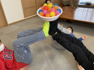 ボウルの中にあるボールが落ちないようにしながら、1人ずつ片手を離して靴下を脱ぎます!