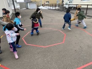 今回の集団遊びは、ドーナツしっぽとり!外にでて行いました!