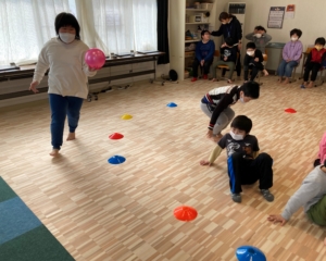 1対1で向き合い職員がボール!と言ったら真ん中にあるボールを取ります!