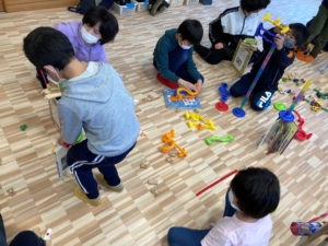 ぬいぐるみを土台にする子や、絵本を土台にする子など、、みんなそれぞれ知恵を絞って組み立てています💪