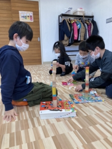 いつもみんなが遊んでいるおもちゃを自由に積み上げてもらい、誰が1番高く積み上げられたかの