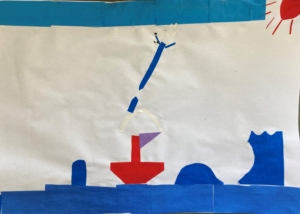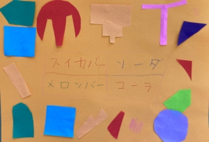 折り紙を〇△□の形に切ってもらいそこからなにかに見立てて作品作りをしました!